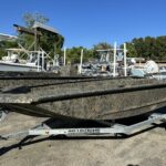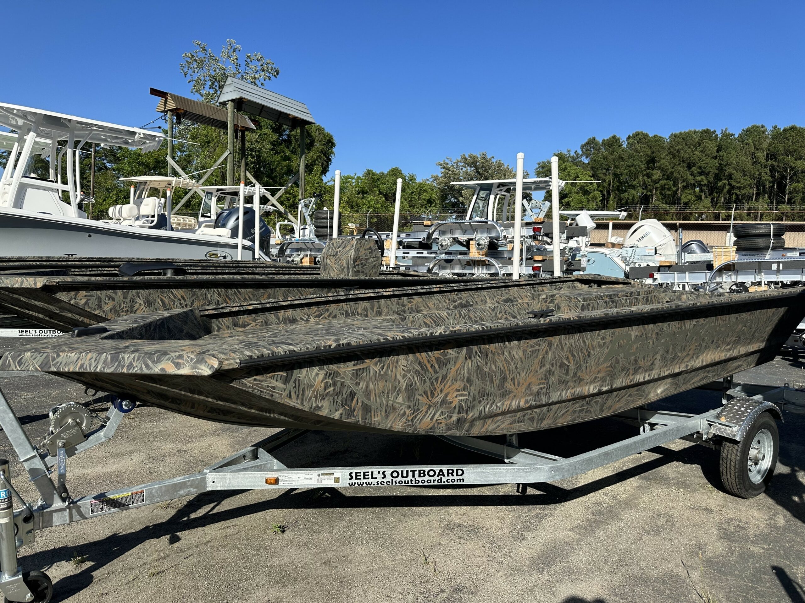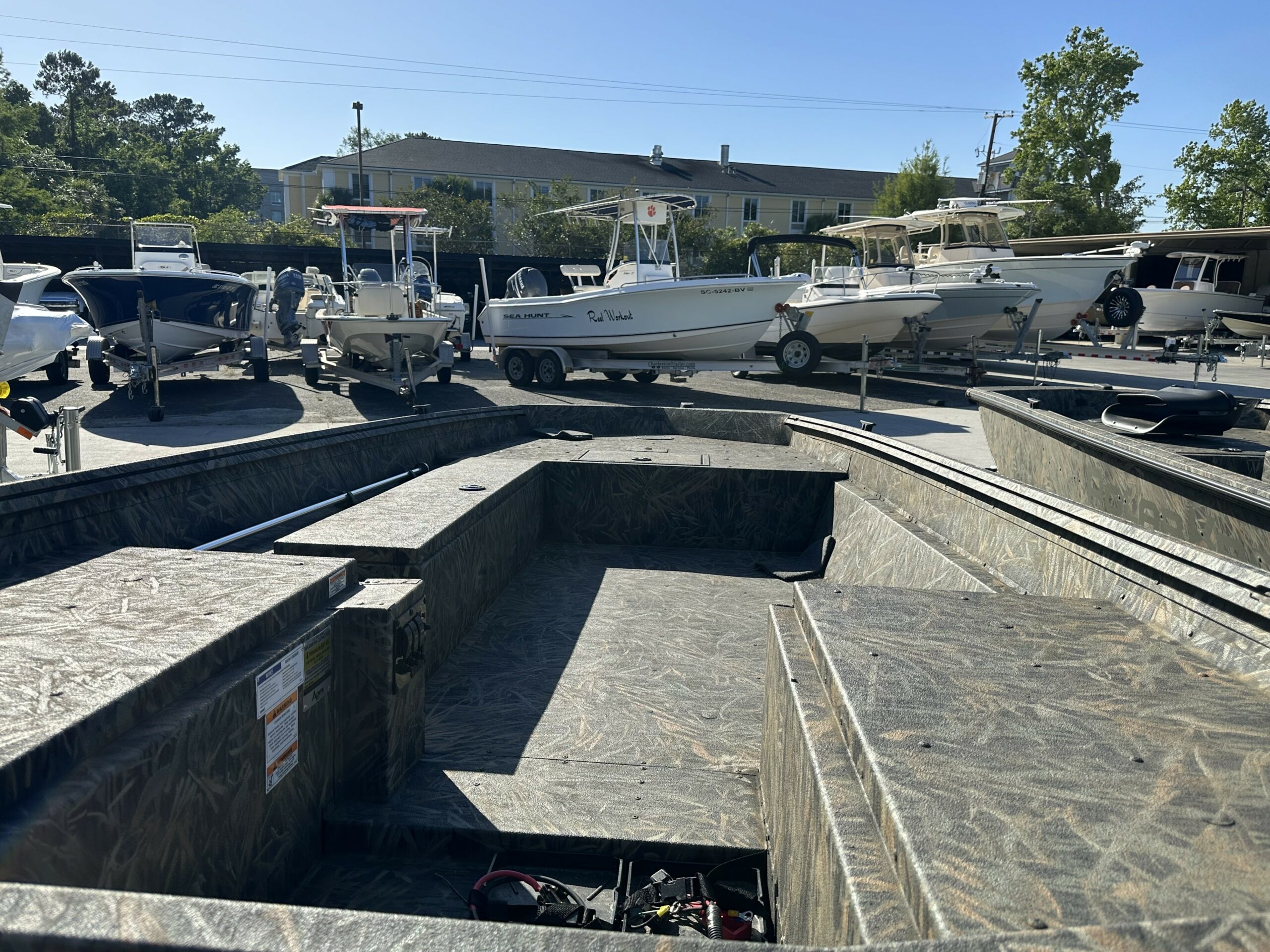 ALL WELDED – ROOM FOR PORTABLE FUEL TANK – BOW STORAGE – 4 COMPOSITE CLEATS – 1000 GPH BILGE PUMP – BOW CASTING DECK – 6 GAUGE 12/24 V TROLLING MOTOR HARNESS