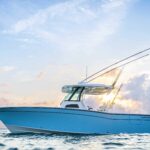 Head – Lockable Console w/Lighting, Shower, Sink, Bulk Storage Drawers, Helm Access Door w/Light, Composite Cherry & Holy Sole, Fold Down Seat & Marine Head w/Electric Flush, 7.5-Galon (28 l) Holding Tank w/Macerator, Overboard Discharge & Deck Pump Out Seating – Molded Forward Console Seat w/Cushion Steering – Helm Master EX w/Integrated Digital Electric Steering (Does not Include Joystick) Steering Wheel – 316 Grade Stainless Steel w/Knob Storage – Under Footrest T-Top – Fiberglass w/Painted Aluminum Frame, Radio box, Storage net, tri-Colored (Red, Blue, White) LED Recessed Lights (4), Fore/Aft Spreader Lights, Rod Holders (4), Radar Flat & Outrigger Plates Window – Tinted Frameless Acrylic Windshield – Laminated Glass Integrated w/T-Top Windshield Wiper w/Washe