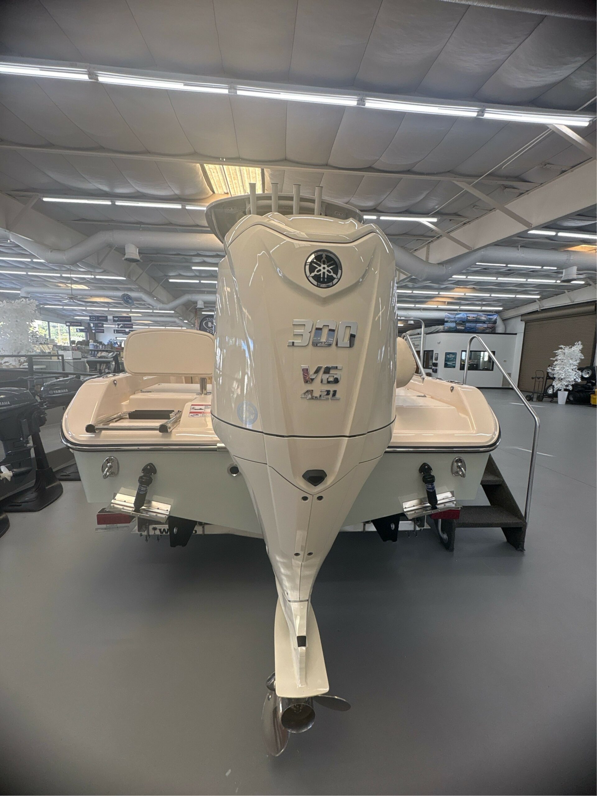 Cockpit & Deck 100% Hand Laid Seav hul & Deck Batteries (2) w/Battery Select Switch (1) Cleats – Flush Mount (pul up) Cockpit Lights – Blue LED Cockpit Freshwater Shower (Recessed) Deck Hardware – 316 Grade Stainless Steel Through-Bolted Drink Holders – Stainless Steel (8) Engine Flush System w/Hose Attachment Aft