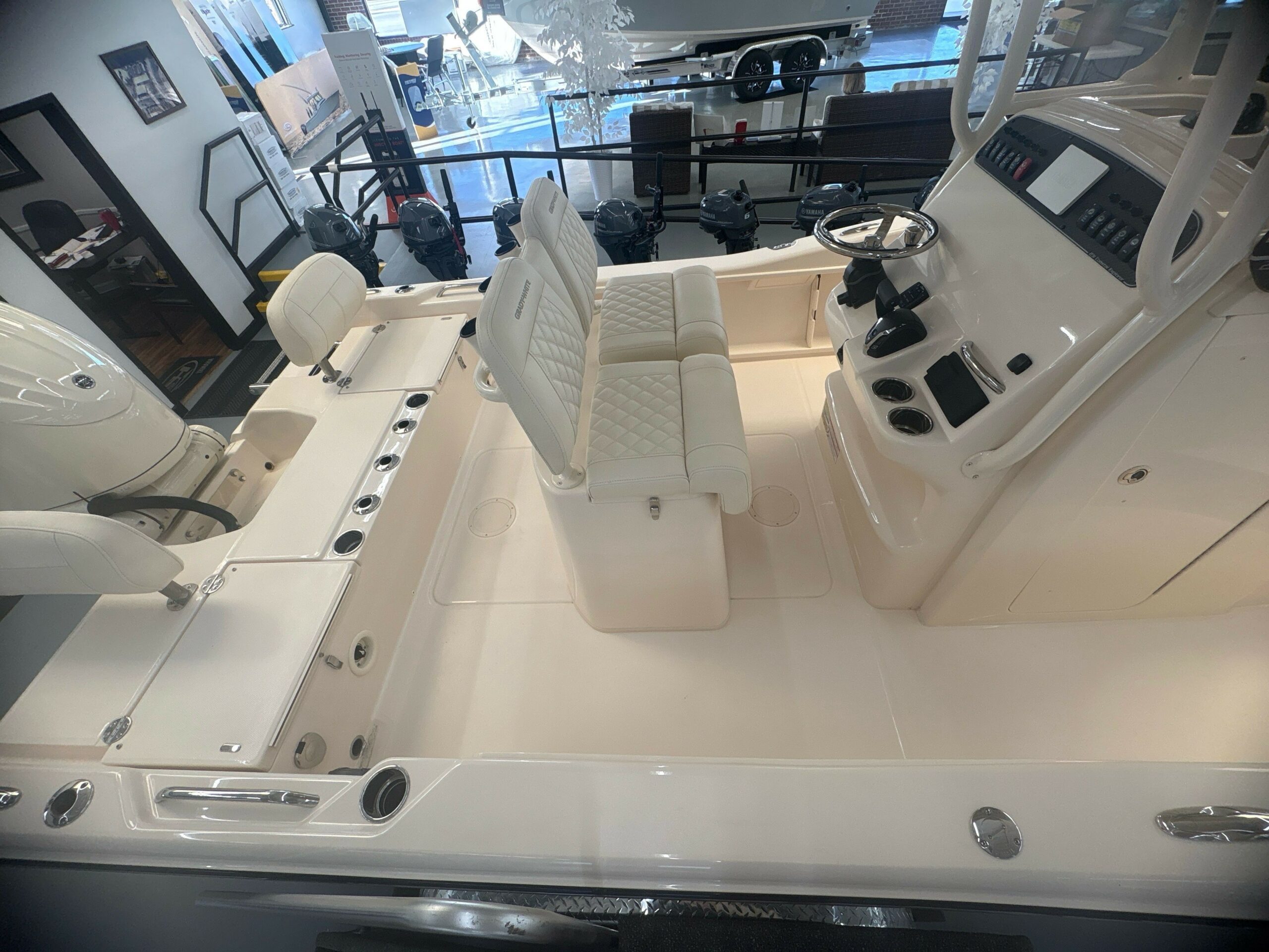 Console Accessory Outlet – 12V (2) Compass Drink Holders – Stainless Steel (2) Fish box – 29-qt. (27 l) Insulated Storage box Under Forward Console Seat Flush Mount Electronics Area Head – Lockable Console w/Portable Head, Stand up Head Area, Indirect Lighting, Bulk Storage & Composite Cherry & Holy Sole