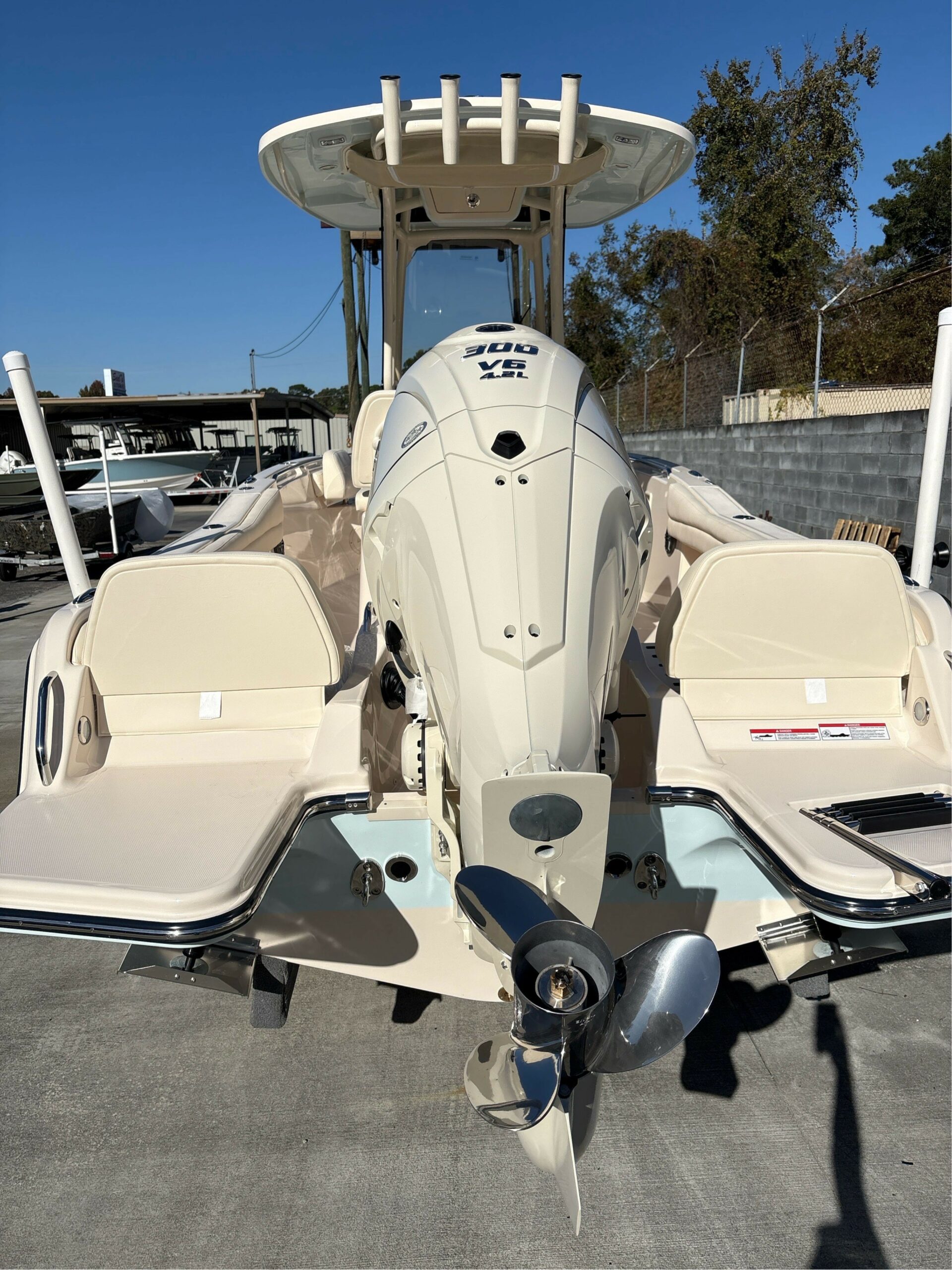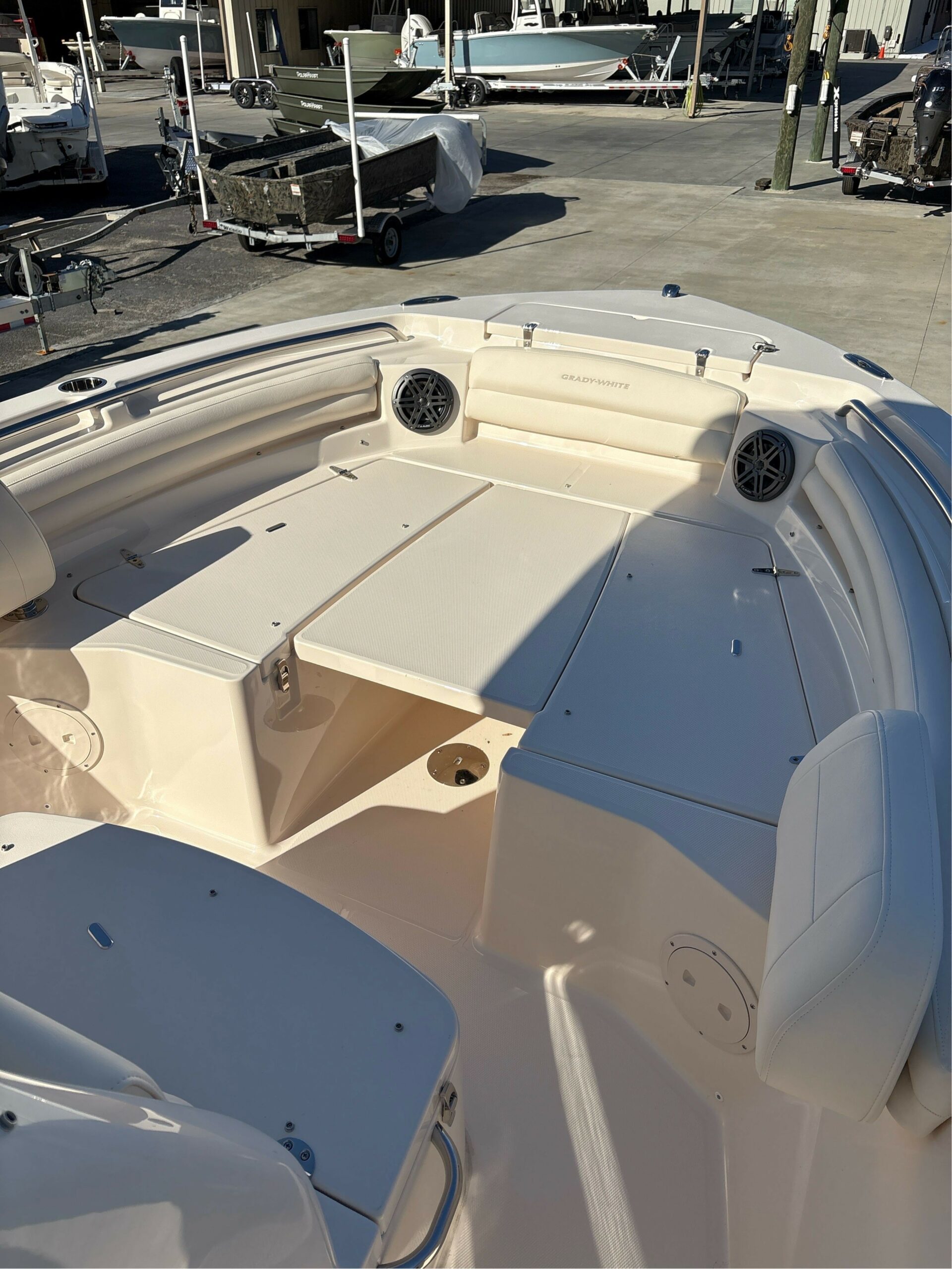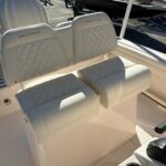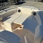 Seating – Port & Starboard Cushioned Bow Seating w/Forward Facing Foldaway Bolstered Backrest (2) Stereo System w/Waterproof Touch Screen Display, AM/FM Tuner & Wi-Fi & Bluetooth Connectivity; Speakers – Bow (2), Helm (2) Stern Eyes – 316 Grade Stainless Steel Storage – Forward Anchor Locker w/Rode Storage Swim Platforms – Aft Port & Starboard Extensions w/Starboard Ladder Washdown – Pressurized raw Water w/Hose