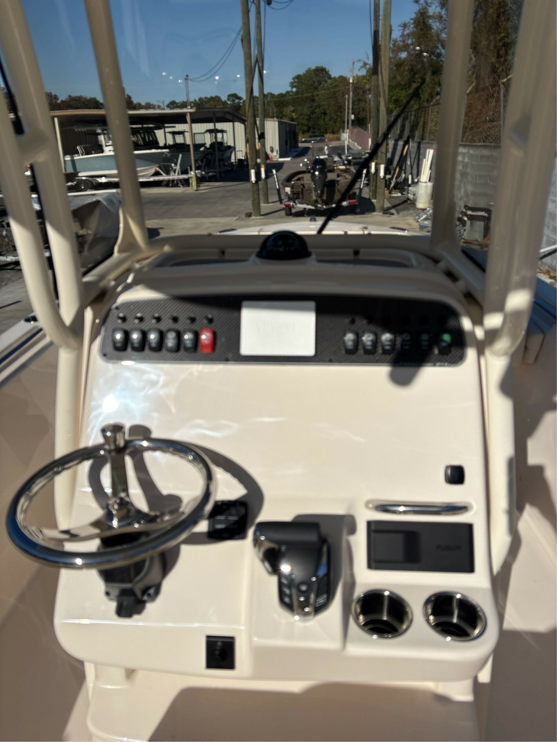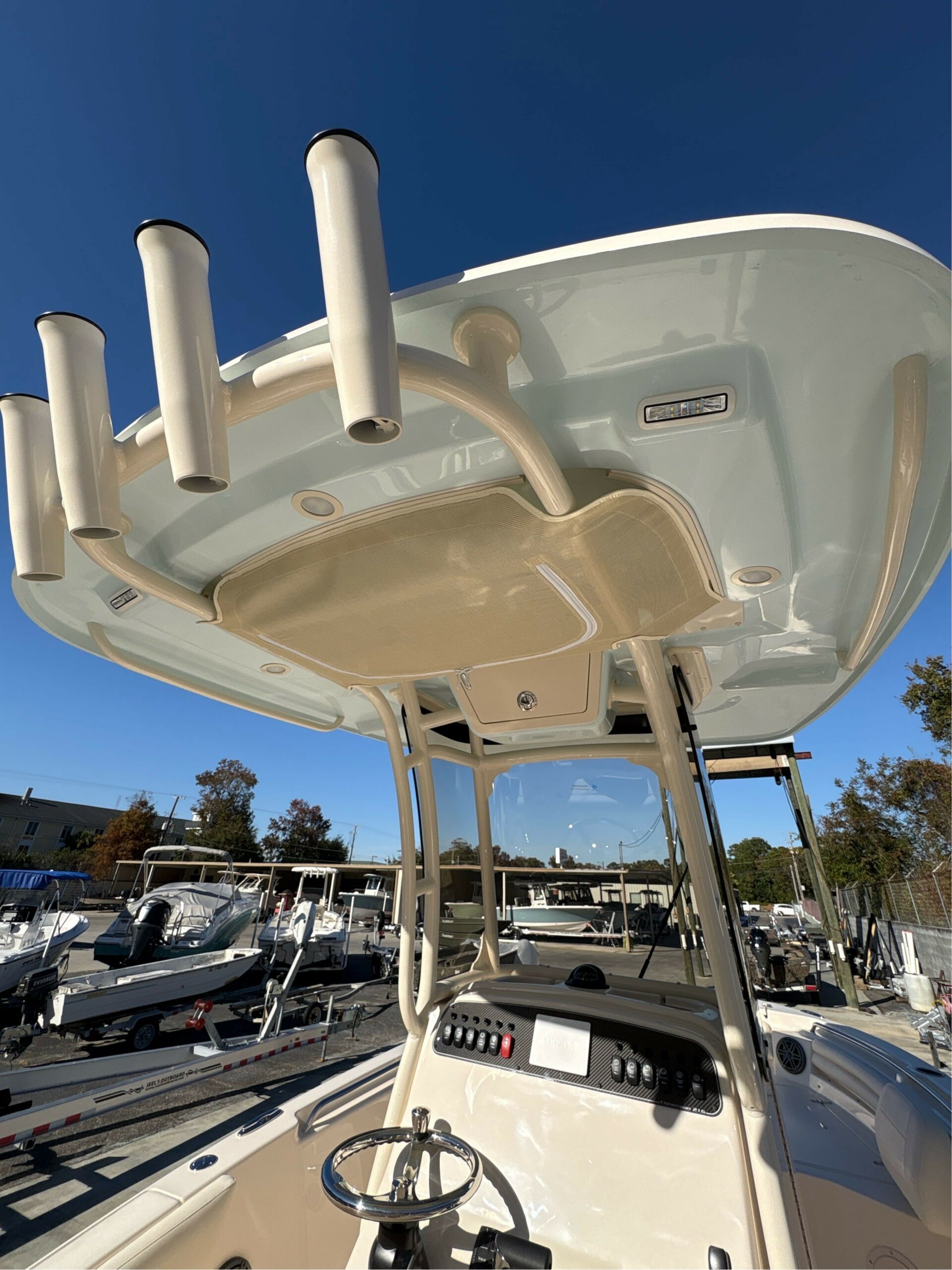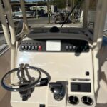 Head – Lockable Console w/Portable Head, Stand up Head Area, LED Lighting, Storage & Composite Cherry and Holy Sole Seating – Molded Forward Console Seat w/Cushion, Backrest & Insulated Storage Underneath Steering – Hydraulic Tilt Steering Wheel – 316 Grade Stainless Steel w/Knob T-Top – Fiberglass w/Painted Aluminum Frame, Storage net, LED Spreader Lights, Rod Holders (4), tri-Colored (Red, Blue, White) LED Recessed Lights (3) & Radar Flat Windshield – Scratch Resistant Acrylic Integrated w/T-Top