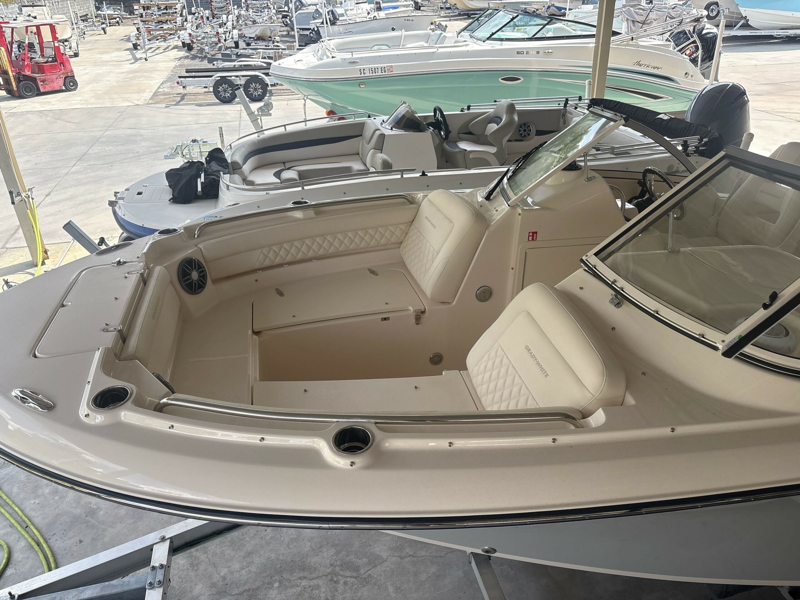 Companion Grab Rail Compass Cooler – 64-qt. (60 l) Aft Insulated Cooler Deck Hardware – 316 Grade Stainless Steel Through-Bolted Drink Holders – Stainless Steel (9) Engine Flush System w/Hose Attachment Aft Factory Engine pre-Rigging Fish/ice Boxes – 56-qt. (53 l) Port & Starboard Bow Insulated Boxes w/ob Drain Flush Mount Electronics Area Forward Bolsters Head – Lockable Port Console Area w/Lighting, Portable Head, Mirror, Storage & Composite Cherry & Holy Sole Hydraulic Trim Tabs w/Indicator & Retractor