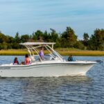 Cockpit Freshwater Shower (Recessed) Cockpit Lights – Blue LED Companion Grab Rail Compass Deck Hardware – 316 Grade Stainless Steel Through-Bolted Drink Holders – Stainless Steel (9) Engine Flush System w/Hose Attachment Aft Factory Engine pre-Rigging Fish/ice box – 160-qt. (151.4 l) Aft Insulated box w/ob Drain Fish/ice box – 89-qt. (84.2 l) Starboard Bow Insulated box w/ob Drain Flush Mount Electronics Area Footrest – Helm Forward Bolsters Hardtop w/Painted Aluminum Frame, Storage net, Side-Mounted Rod Holders (4), LED Spreader Lights, tri-Colored (Red, Blue, White) Recessed Lights (4), Radar Flat, tow eye Hardware & Outrigger Plates Head – Lockable Port Console Area w/Lighting, Mirror, Storage & Composite Cherry & Holy Sole Hydraulic Trim Tabs w/Indicator & Retractor