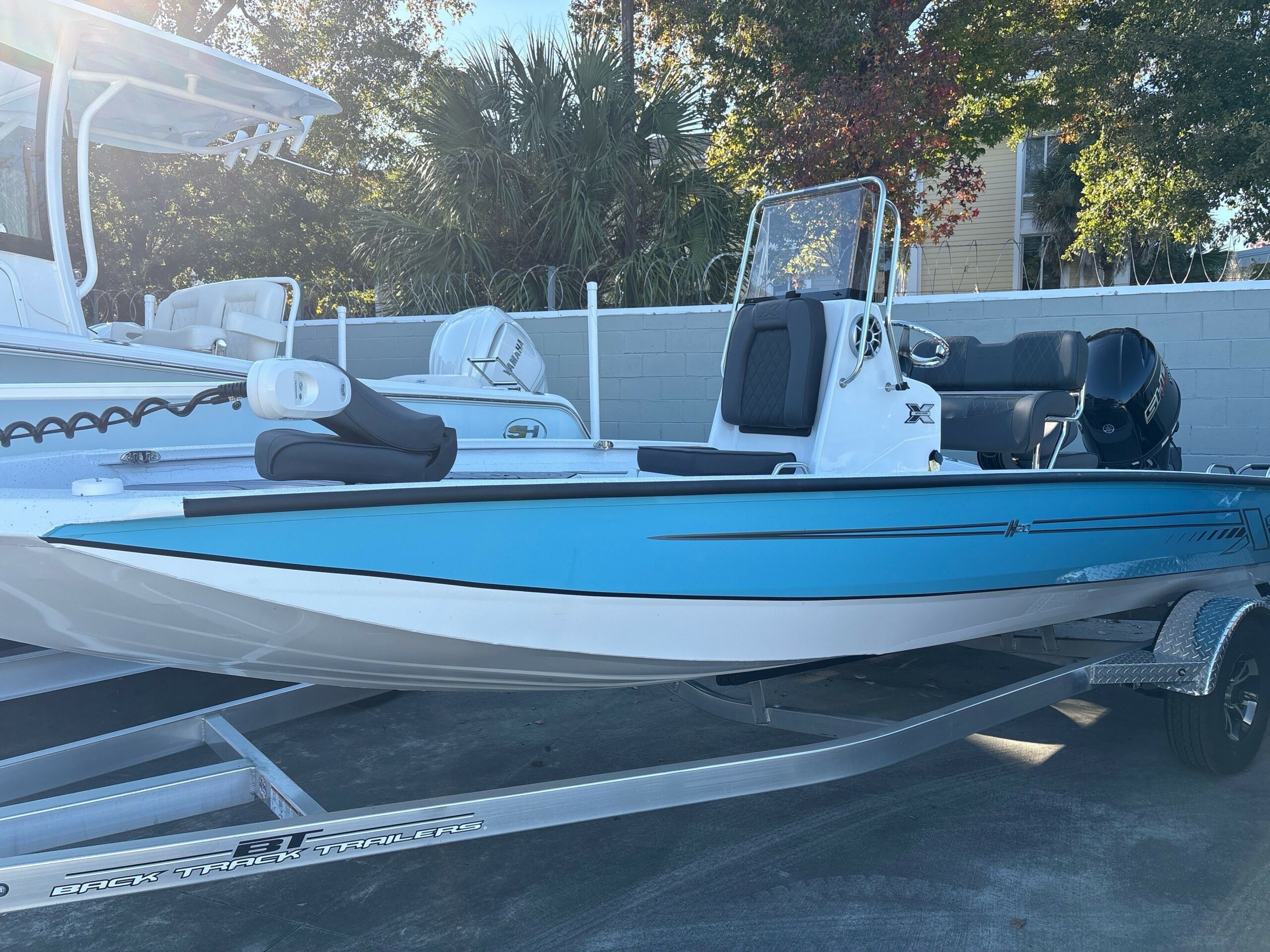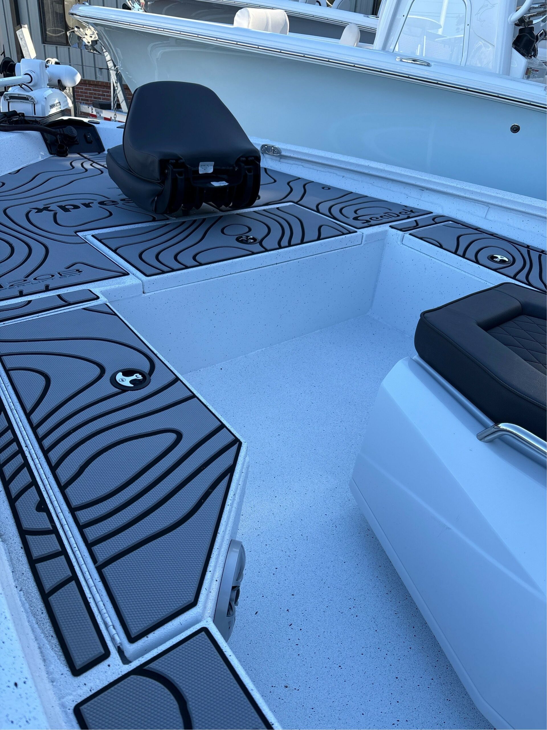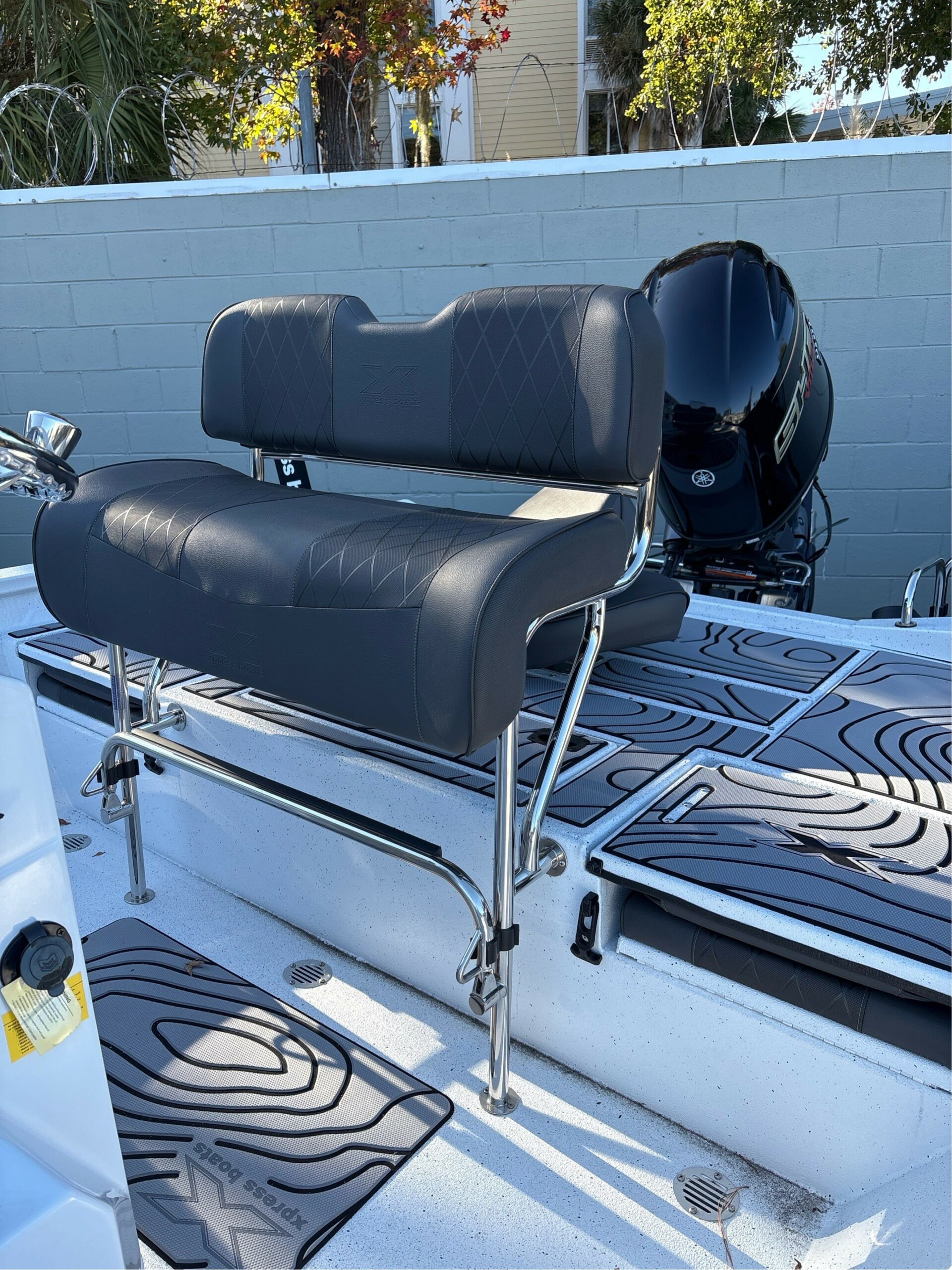 • COLOR – BASE/CONSOLE – WHITE — ACCENT COLOR- BAHAMA STRIPE –SEATS/CUSHIONS – CHARCOAL (2 FISHING SEATS, 1 JUMP SEAT)
